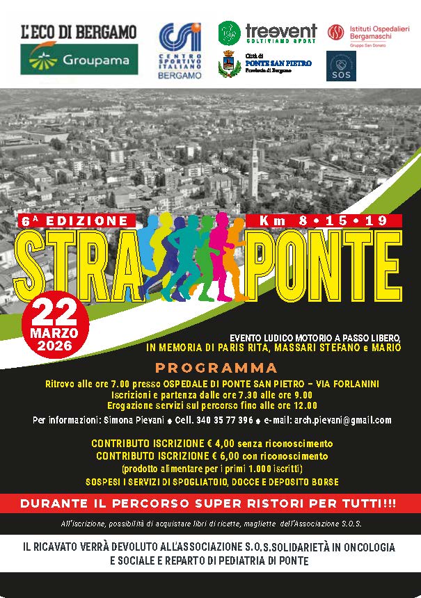 Anche quest’anno l’iniziativa è resa possibile grazie alla collaborazione sinergica tra i volontari del Comune di Ponte San Pietro, il gruppo podistico Treevent, l’Associazione S.O.S. – Solidarietà in Oncologia e Sociale e gli Istituti Ospedalieri Bergamaschi. Un lavoro di rete che conferma il valore dell’evento non solo come momento sportivo, ma come autentica espressione di partecipazione e coesione territoriale.
